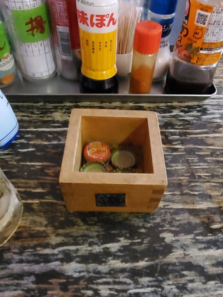 お酒のおかわりは、この瓶のフタを店員さんに渡すシステム。